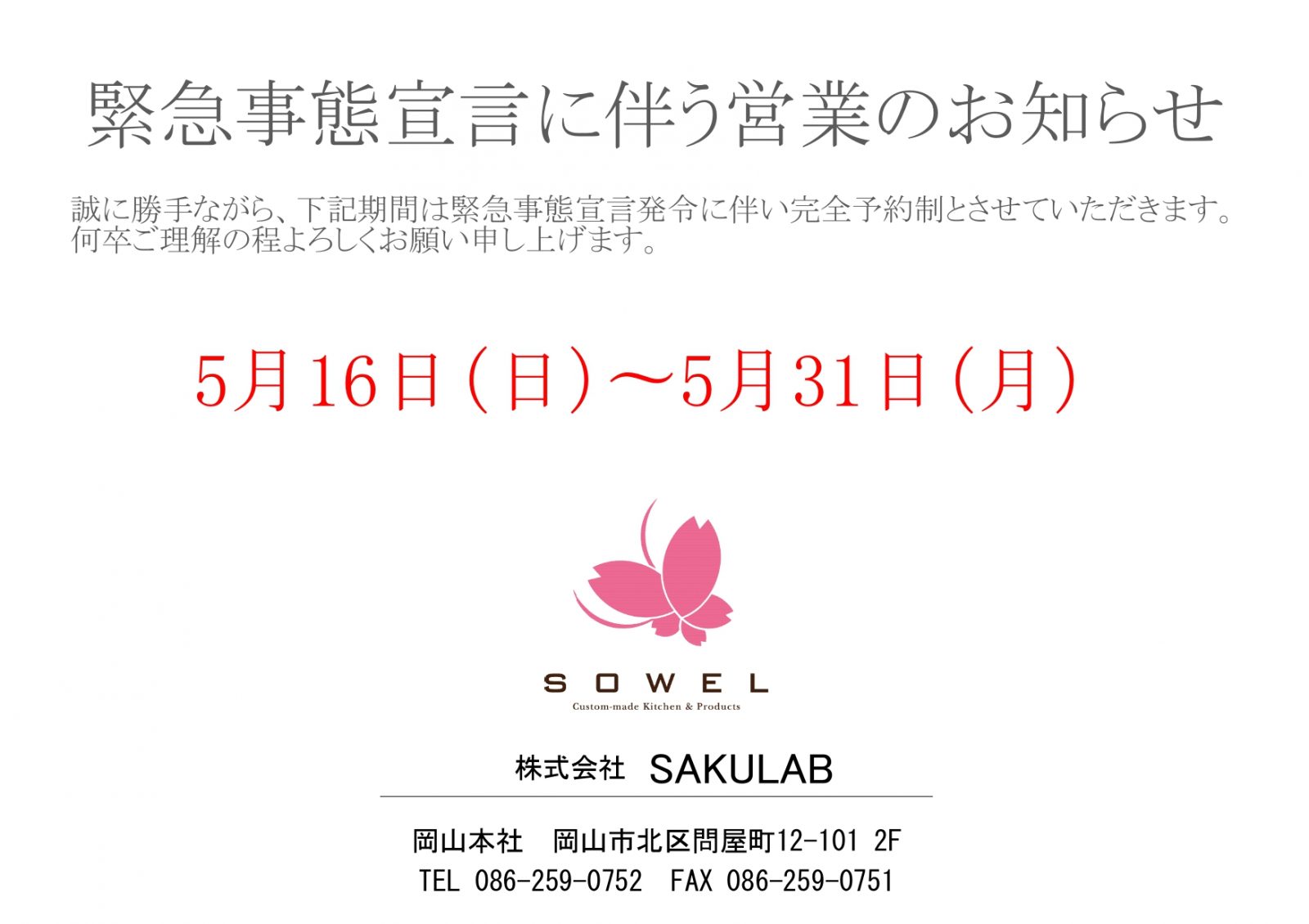 SOWELショールームでは5月17日(月)~31日(月)の間、予約不要の自由見学を中止いたします。