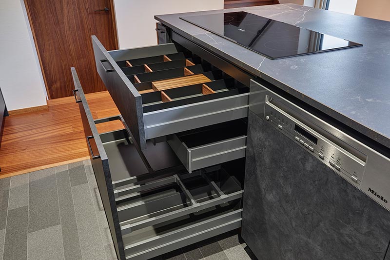 SOWELのキッチン収納は、耐久性と機能性に富んだ金物と、歪みの少ない丁番、そして重たい食器や調理器具が入ってもガタつくことなくスムーズに開閉できる完全スライド引出を採用しています。