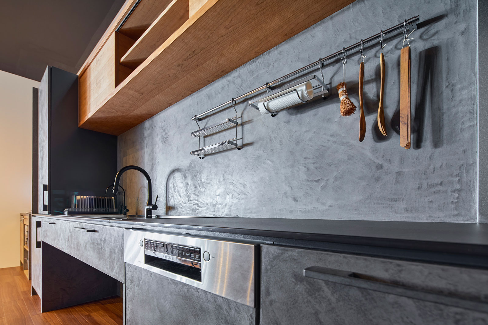 ナチュラルクォーツ・セラミック大判タイルを使用したキッチン。