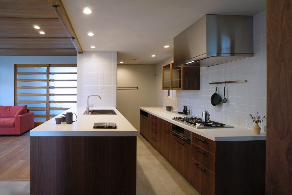 そのロケーションを窓越しに見ながら、 家族で料理を楽しみたいとのご要望をいただき、V字型キッチンとアイランドキッチンを組み合わせました。