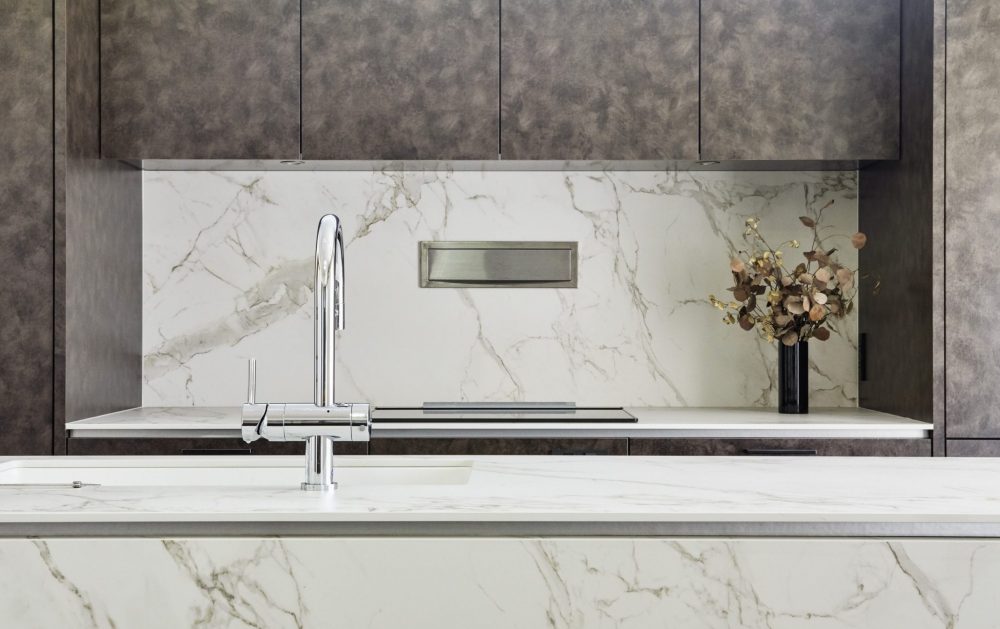コンクリート調のカウンターと、深みのあるブラックチェリーの扉で、特別な空間に彩りを添えました。