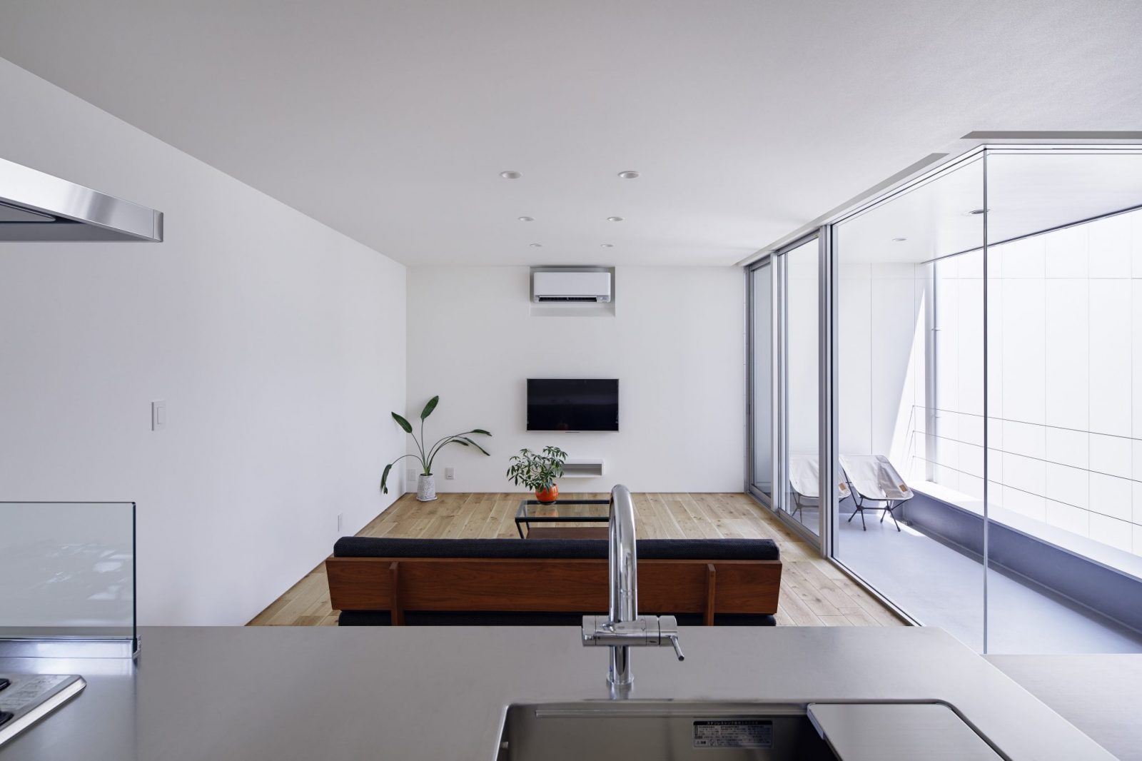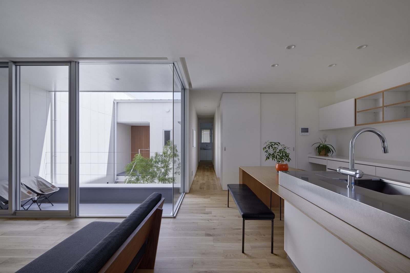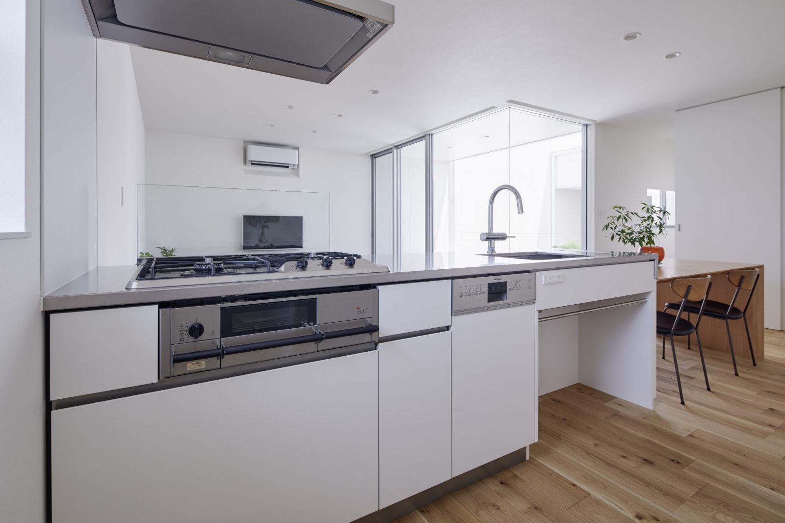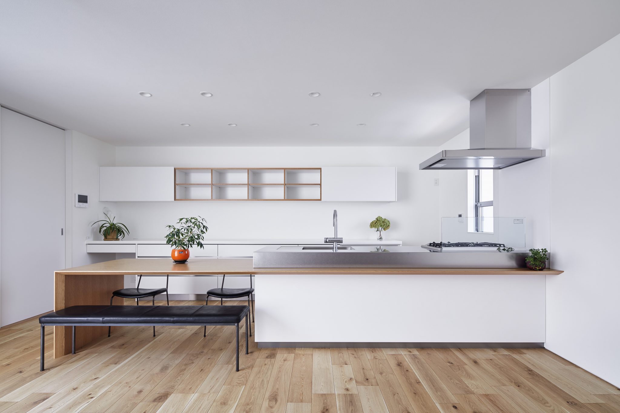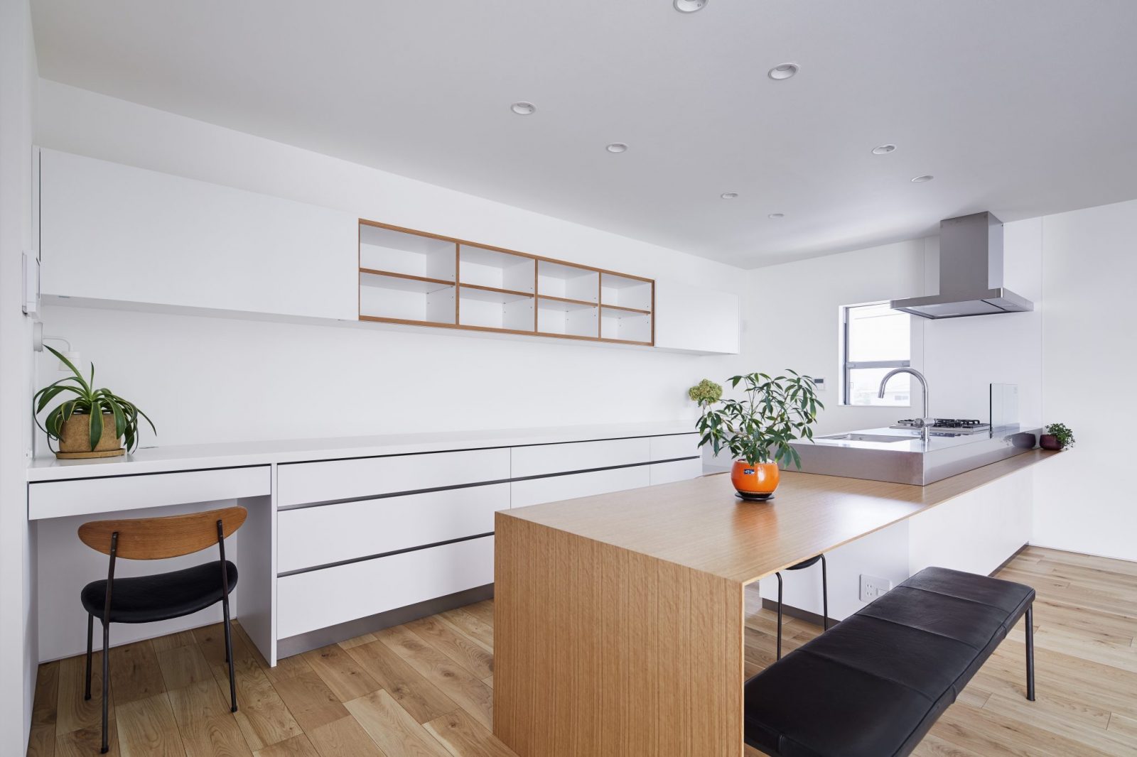 すべて真っ白+ステンレスカウンターのキッチンをご要望でしたが、生活スタイルなどをヒアリングした結果、キッチンとテーブルが一体のプランを提案させていただきました。