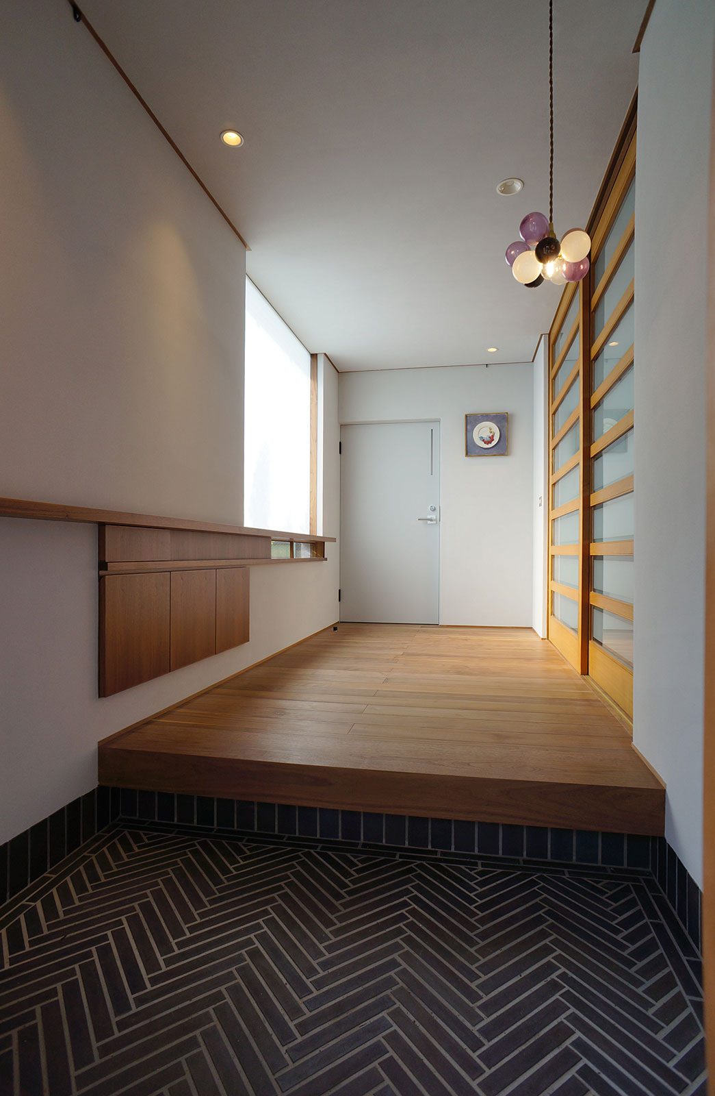 玄関には、キッチンと同じウォールナットで小さな玄関収納をしつらえました。