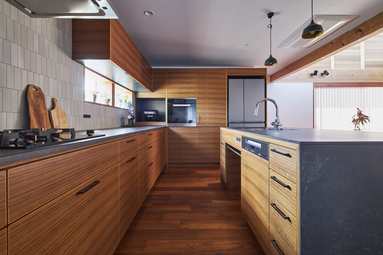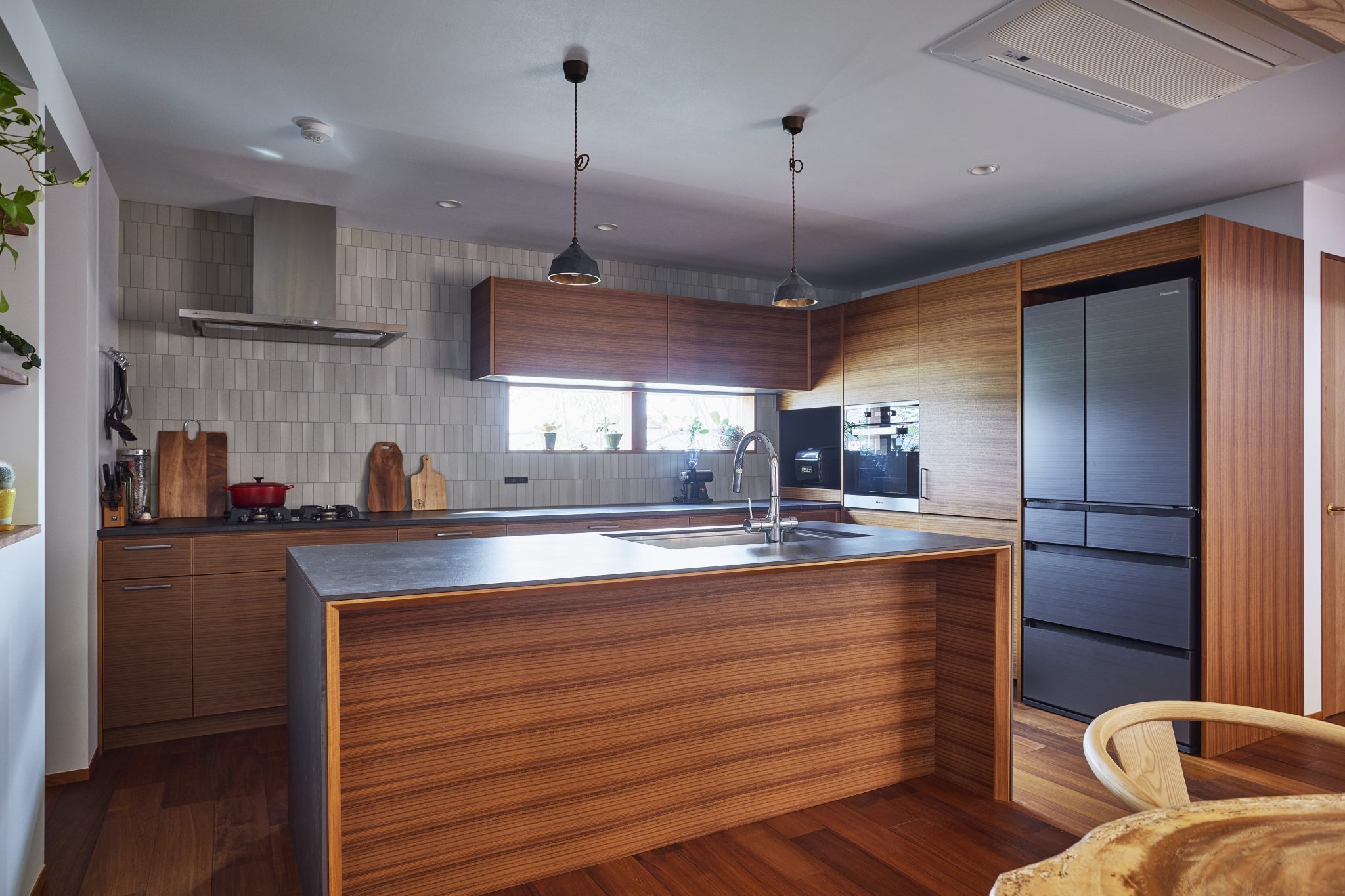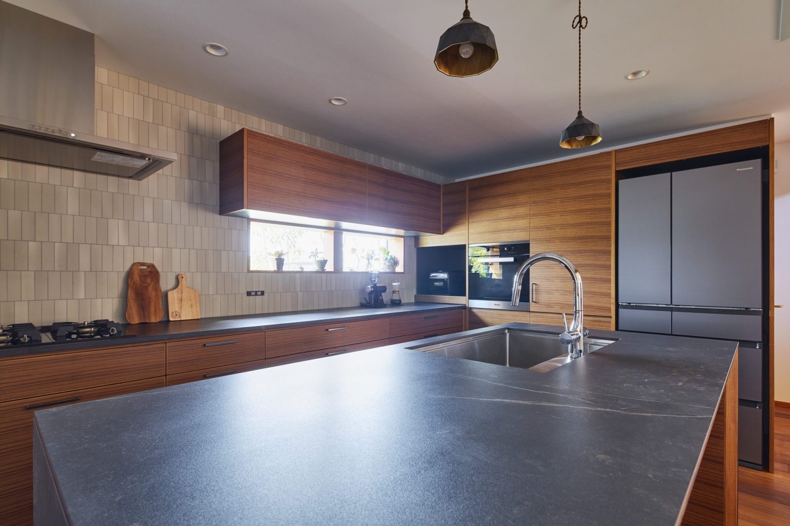 チーク(柾目)の扉と大判セラミックタイルを使ったキッチン。