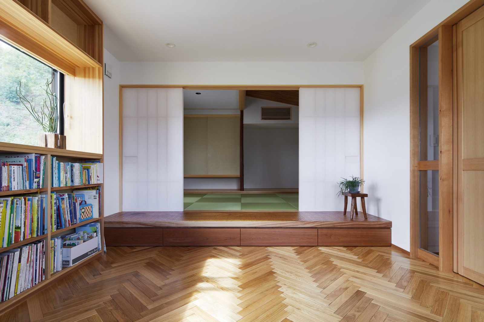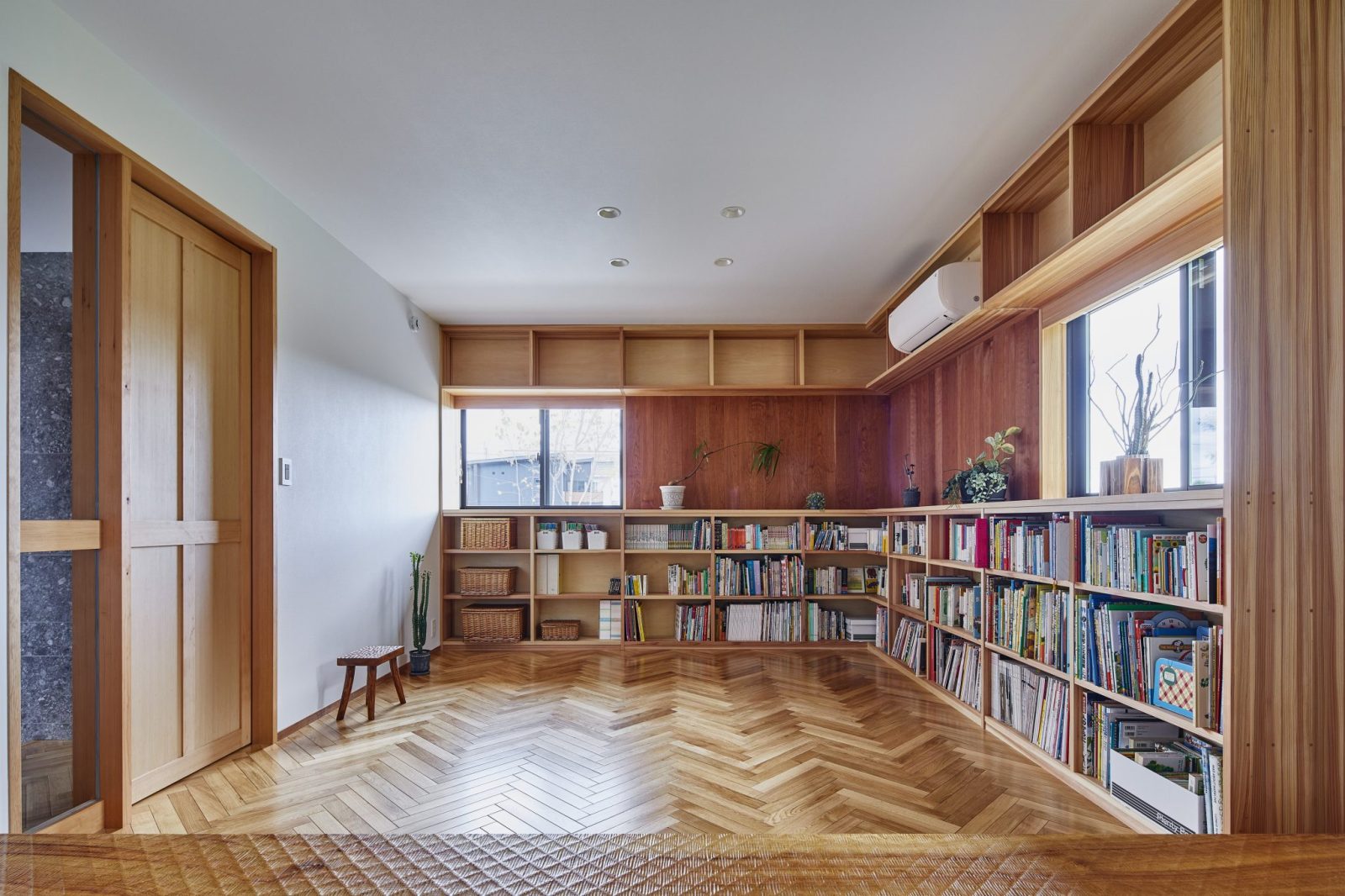 この書庫が窓枠も兼用してる一体型の家具となっています。